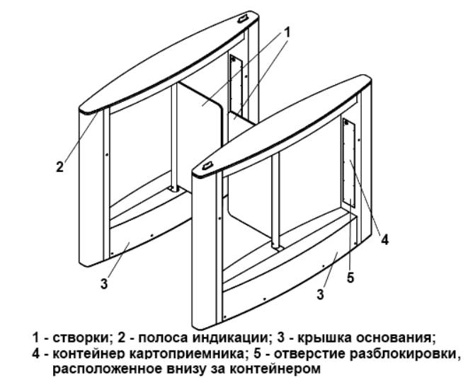 Корпус турникета выполнен из шлифованной нержавеющей стали, преграждающие створки – из закаленного стекла. Конструкция турникета может иметь в своем составе интегрированный картоприемник. В нижней части модуля предусмотрена крышка основания для доступа к отверстиям для ввода кабелей БП, ПУ и СКУД.