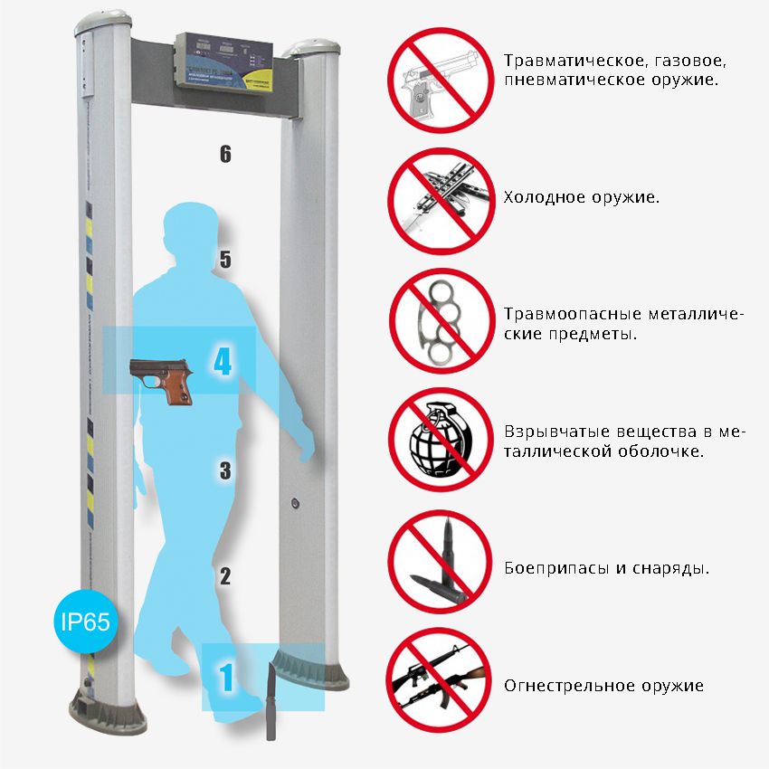 Металлодетектор колонного типа, 6 зон обнаружения, ширина прохода 720мм, световая (зональная) и звуковая индикация, настройка чувствительности, работа с цветными и черными металлами, напряжение 90-264VAC(47.5-63Гц), 40Вт, -20...+70°С, IP65, 2230х940х270мм, в комплекте - пульт дистанционнного управления