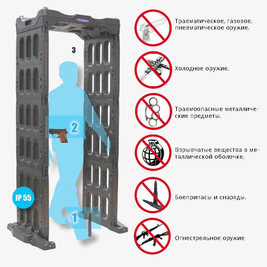 Степень пылевлагозащищенности - IP-55. Он очень прост в использовании и в настройке. Наличие светодиодных индикаторов, располагающихся по боковым антенным панелям, позволяет очень быстро оценить местоположение запрещенных металлических предметов на теле человека.