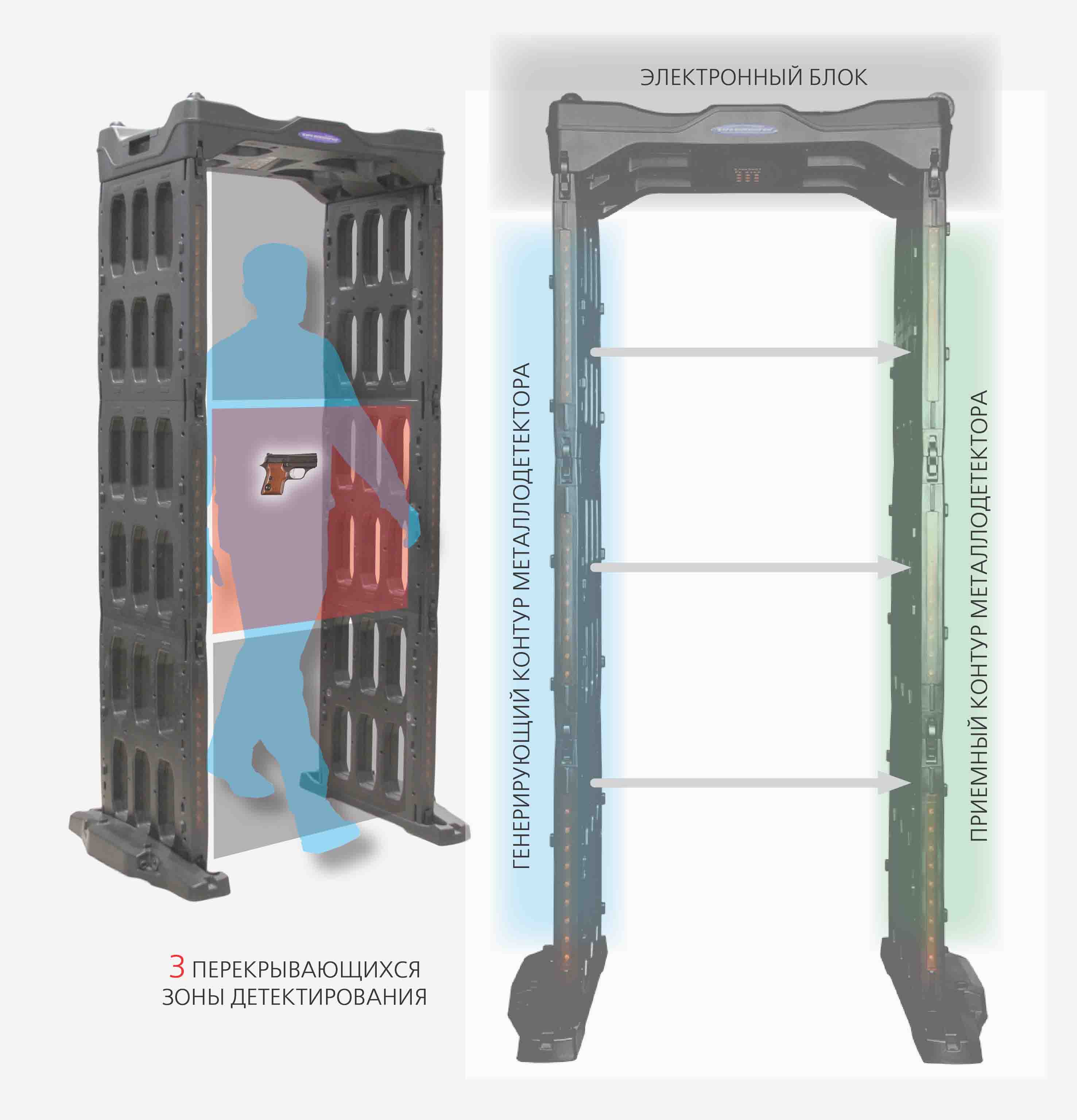 Многозонный металлодетектор имеет возможность точно определить местонахождение одного или нескольких металлических предметов на теле человека, благодаря чему уменьшается время досмотра.