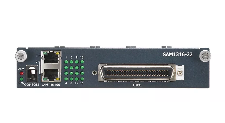 В коммутаторе IES-1000 может быть установлено до 2 модулей SAM1316-22. Для подключения SHDSL-абонентов используется порт Telco-50. Модули допускают установку в шасси без отключения напряжения питания (hot-swappable).