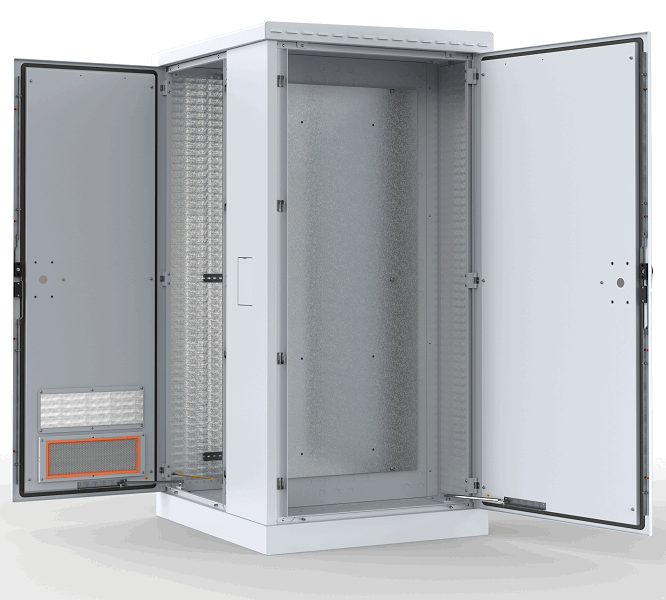 Под крышей установлены транспортировочные уши удобства перемещения и монтажа. Вместо стандартной крыши возможно установить крышу с выдвижным козырьком (в комплект поставки не входит). Цоколь шкафа высотой 100 мм, съёмный можно заменить на 300 мм либо 600 мм с окнами для доступа к кабелям (в комплект поставки не входит). Телекоммуникационный отсек стандартно комплектуется двумя парами вертикальных направляющих 19”, две DIN-рейки и два воздушных фильтра. Доступ в отсек через переднюю вентилируемую и заднюю двери. Вместо задней двери возможна установка стенки (в комплект поставки не входит). Двери с пенорезиновым уплотнителем. запираются ригельными замками и подготовлены для установки дополнительного сувальдного замка (в комплект поставки не входит). Вентиляция отсека осуществляется через крышу и переднюю вентилируемую дверь. При необходимости отсек делится на телекоммуникационный и акуммуляторный с ипользованием разделительной полки (в комплект поставки не входит).