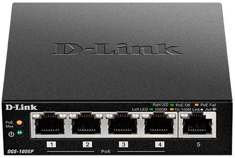4 порта DGS-1005P поддерживают стандарт IEEE 802.3at PoE. Каждый порт PoE подает питание мощностью до 30 Вт при общем бюджете коммутатора 60 Вт, что позволяет пользователям подключать к DGS-1005P устройства, совместимые со стандартом 802.3at. Это позволяет размещать оборудование в труднодоступных местах вне зависимости от расположения электрических розеток и минимизировать прокладку кабеля.