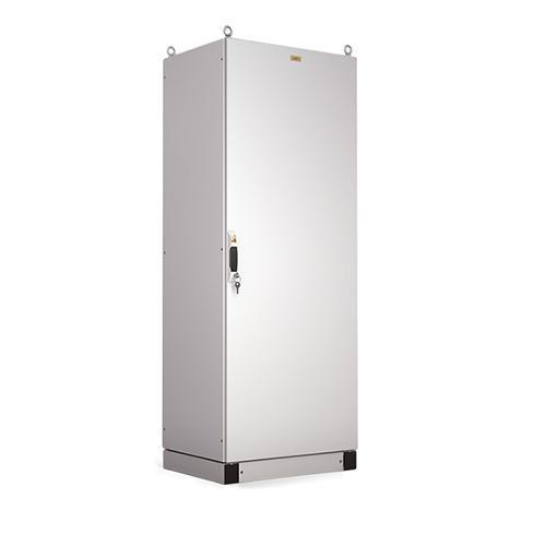 Цоколь выполнен из листовой стали с полимерным покрытием RAL7035 (светло-серый), имеет разборную конструкцию. Опорные кронштейны выполнены из стали 2,0 мм и имеют в фронтальной плоскости окна для свободного доступа к элементам крепления цоколя к каркасу. Окна закрываются пластиковыми заглушками. Боковые и фронтальные панели выполнены из стали 1,5 мм. Опорная нагрузка шкафа приходится на кронштейны, поэтому панели можно демонтировать в любое время для получения доступа к пространству под корпусом.
