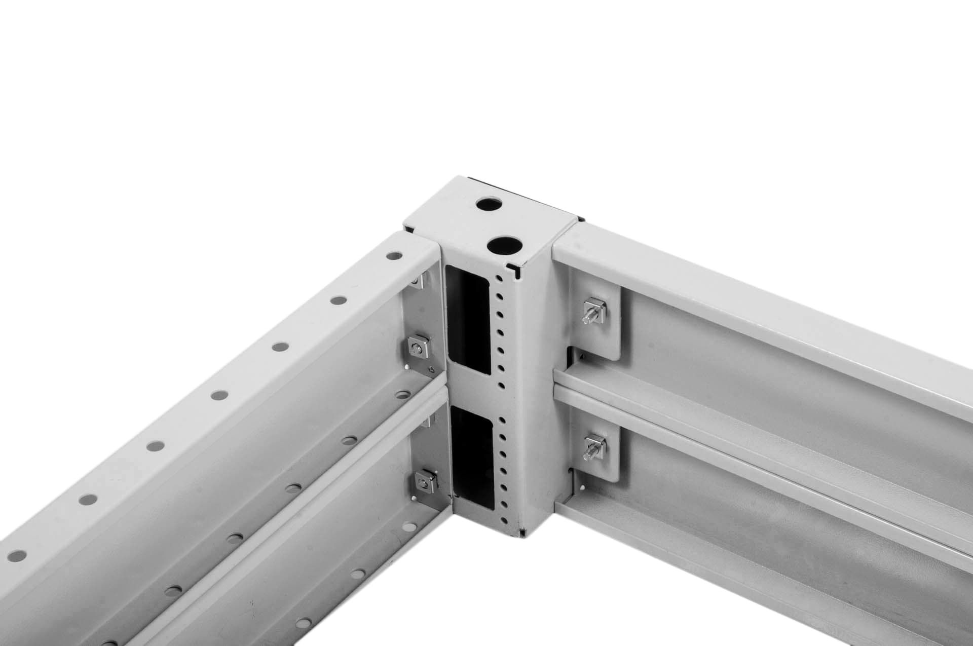 Цоколь выполнен из листовой стали с полимерным покрытием RAL7035 (светло-серый), имеет разборную конструкцию. Опорные кронштейны выполнены из стали 2,0 мм и имеют в фронтальной плоскости окна для свободного доступа к элементам крепления цоколя к каркасу. Окна закрываются пластиковыми заглушками. Боковые и фронтальные панели выполнены из стали 1,5 мм. Опорная нагрузка шкафа приходится на кронштейны, поэтому панели можно демонтировать в любое время для получения доступа к пространству под корпусом.