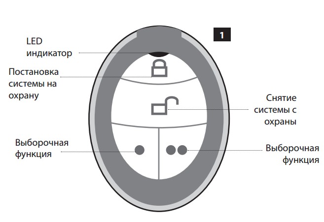 По умолчанию, две кнопки брелка сконфигурированы для постановки/снятия охраны охранной системы.