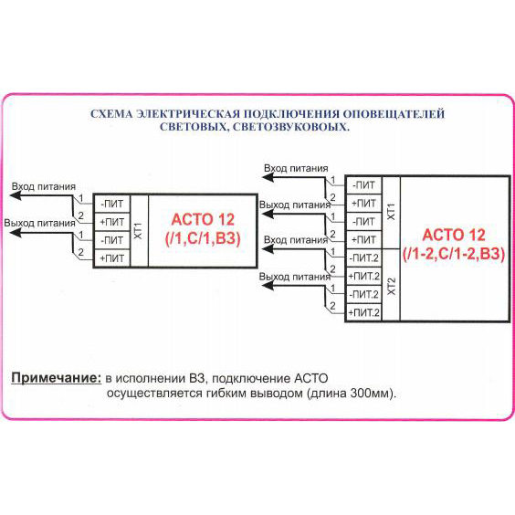 Оповещатели пожарные светозвуковые АСТО 12С предназначены для визуального и звукового оповещения, предупреждения об опасности, для указания путей эвакуационных выходов, в качестве исполнительного элемента системы оповещения. (например, «Выход», «Пожар», «Внимание», «Газ уходи!»). Виды надписей и цвет фона может быть любой по требованию Заказчика.