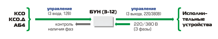 Кроме этого, блок исполнения БУН-3-12 применяется и для контроля наличия напряжения питания 220/380 В на исполнительных устройствах.