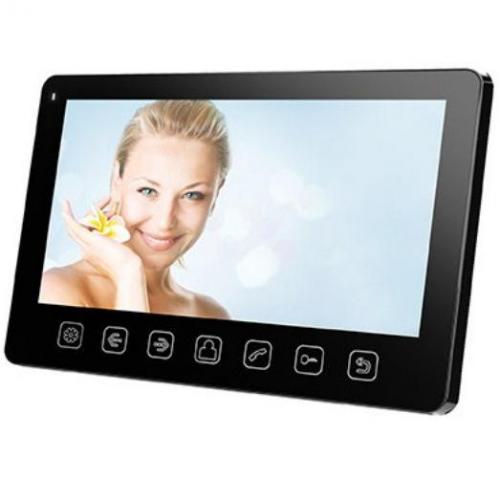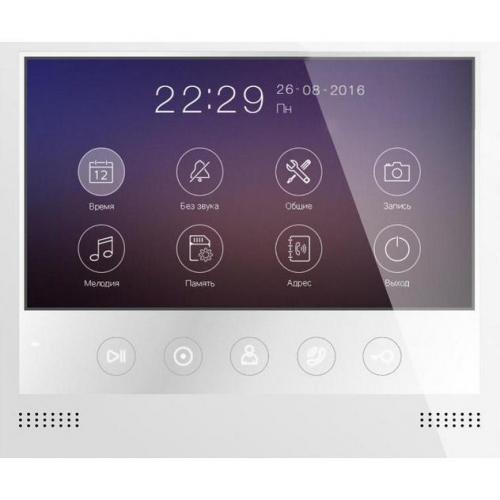 Монитор цветного видеодомофона 7 дюймов, резистивный сенсорный экран, разрешение 800x480, hands free, с функцией Wi-Fi (может работать в беспроводных или проводных сетях Ethernet), подключение 2-х вызывных панелей с возможностью связи вызывных панелей с приложением "vhOme" для iOS и Android, Подключение 2-х видеокамер, до 4-х мониторов в параллель. Встроенная память на 100 фото. Запись фото или видео на microSD карту до 32 ГБ (в комплект не входит). Запись по детектору движения, по одному каналу. Питание 220В. Габариты: 205х128х19мм
