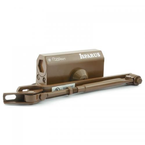 Доводчик для дверей весом 50 - 110 кг. Класс доводчика EN3-5. двухскоростной, с рычажной тягой, установочный размер 165х19 мм, габариты 182х62х40 мм, -45...+60 °С, цвет - серебро.