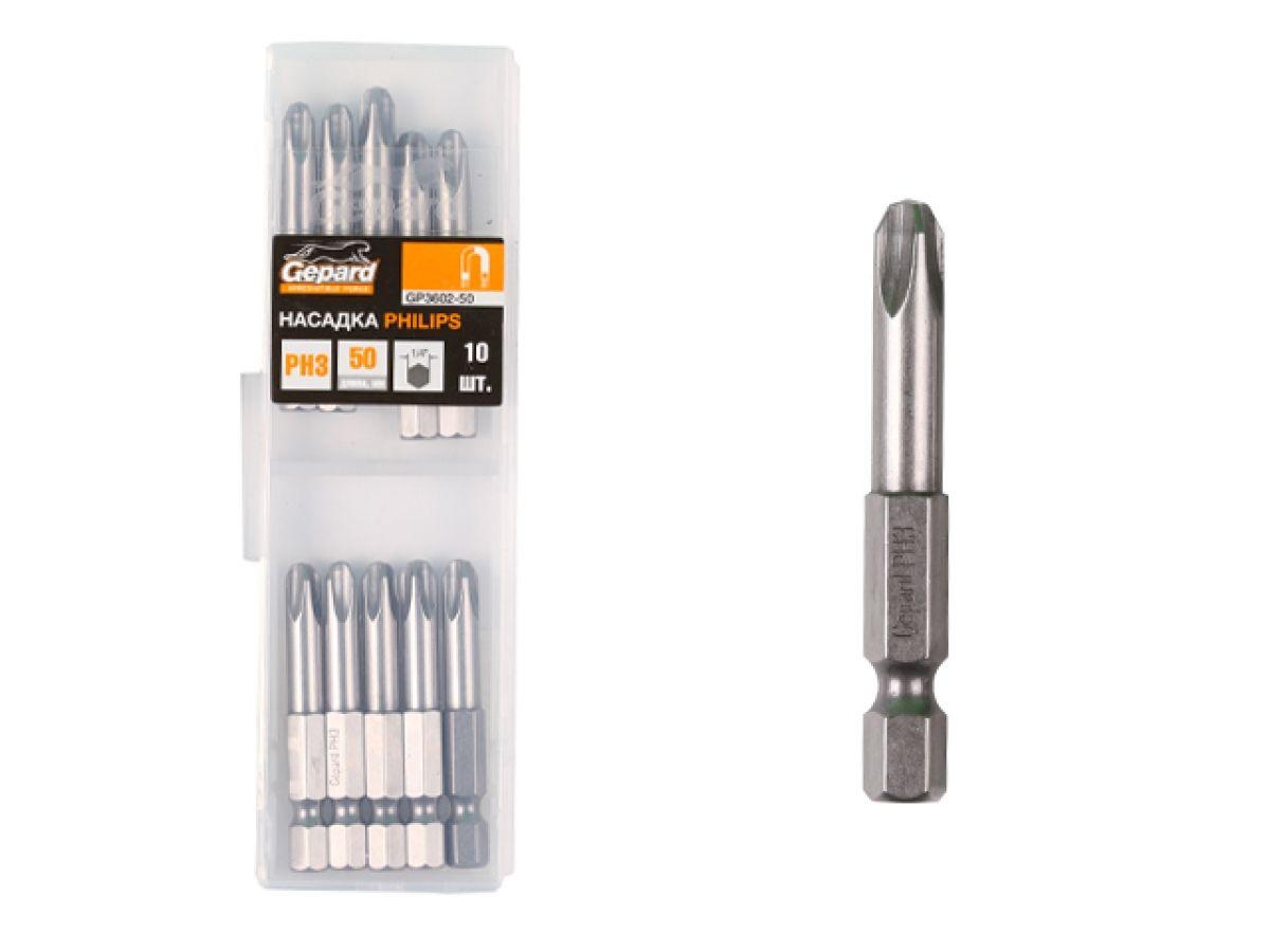 | | Насадка крестообразная PH2 50мм 10шт GEPARD (GP3601-50) (бита Phillips сталь S2 магнитная) |