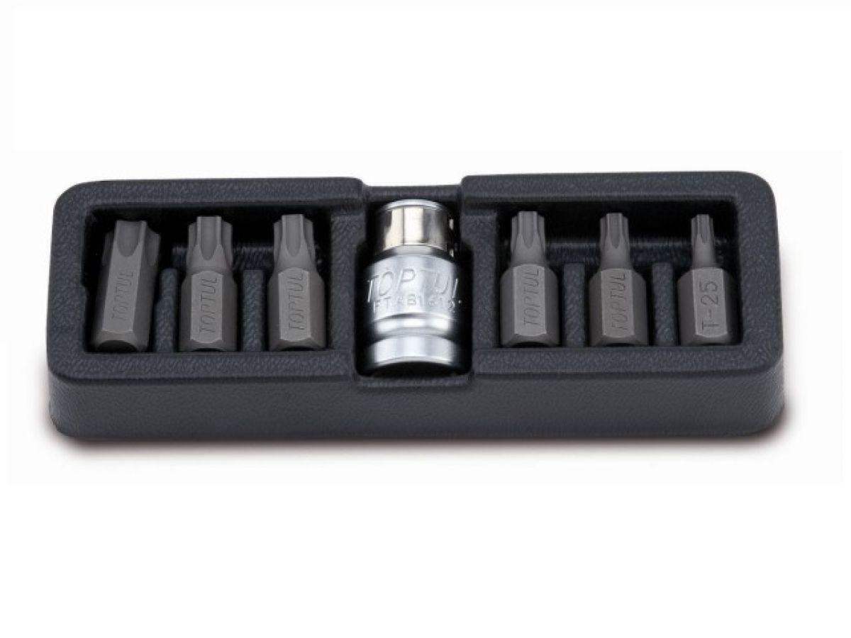 | Набор бит Toptul Torx 1/2" из 7 предметов, содержащий ассортимент бит для выполнения наиболее распространенных операций заворачивания и отворачивания.