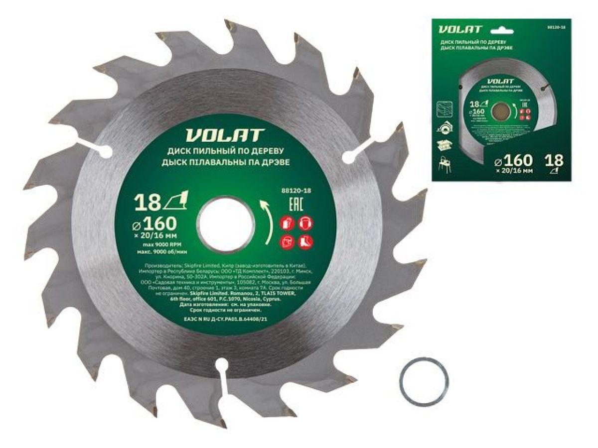 | | Диск пильный 160х20/16 мм 18 зуб. по дереву ВОЛАТ (твердоспл. зуб) |