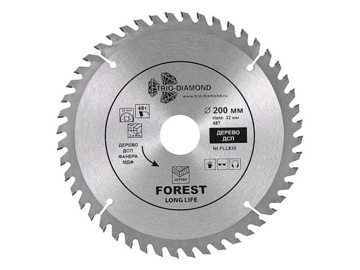 | Диск пильный 200х32/30 мм 48 зубьев TRIO-DIAMOND Forest Long Life (FLL830) предназначен для распила древесины, ДСП, фанеры. Угол заточки 15 градусов. Максимальное число оборотов 7600 RPM.