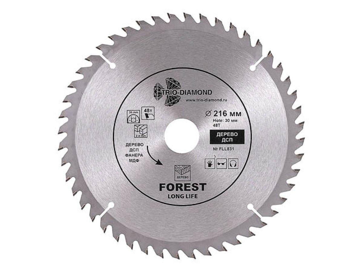 | Диск пильный 216х30 мм 48 зубьев TRIO-DIAMOND Forest Long Life (FLL831) предназначен для распила древесины, ДСП, фанеры. Угол заточки 15 градусов. Максимальное число оборотов 7000 RPM.