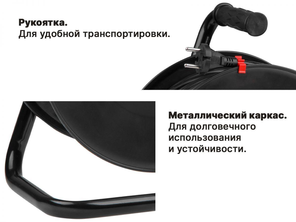 | Катушка из специального пластика на оцинкованной раме. Защита от перегрева. Индикатор показывает перегрев или перегрузку. Эргономичная рукоятка и специальная ось для аккуратной намотки кабеля.