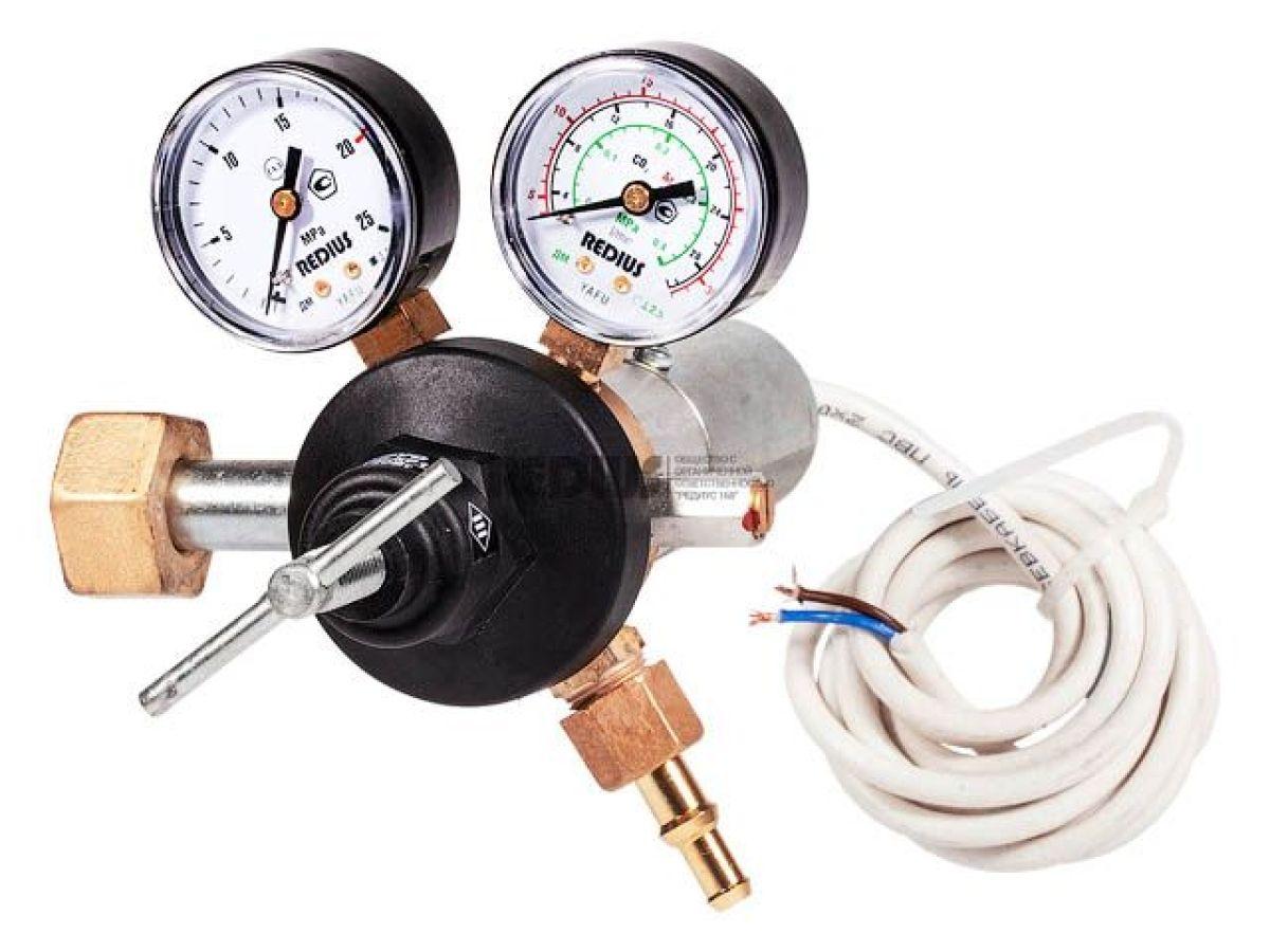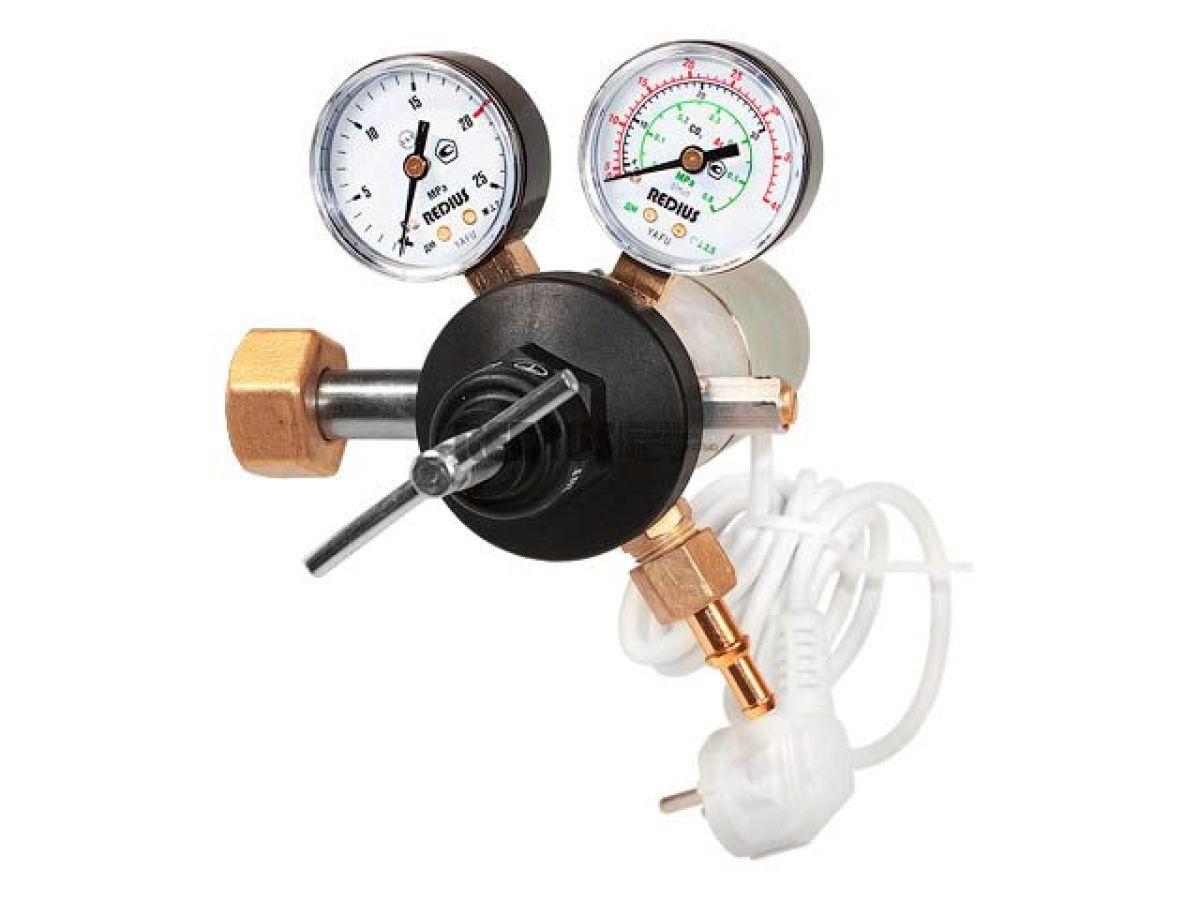 | Регулятор расхода баллонный одноступенчатый предназначен для понижения и регулирования давления углекислого газа или аргона, поступающего из баллона, и автоматического поддержания постоянного рабочего расхода газа на выходе регулятора в ходе проведения работ. Подогреватель используется для предотвращения замерзания механизмов редуктора при больших расходах газа или при низких температурах окружающей среды. Подогрев осуществляется за счет теплообмена между газом и горячими стенками корпуса подогревателя.