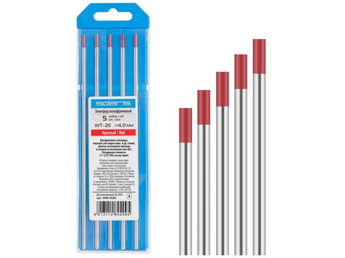 | | Электрод вольфрамовый красный WT-20, Ф 4,0 мм (набор 5 шт) SOLARIS |