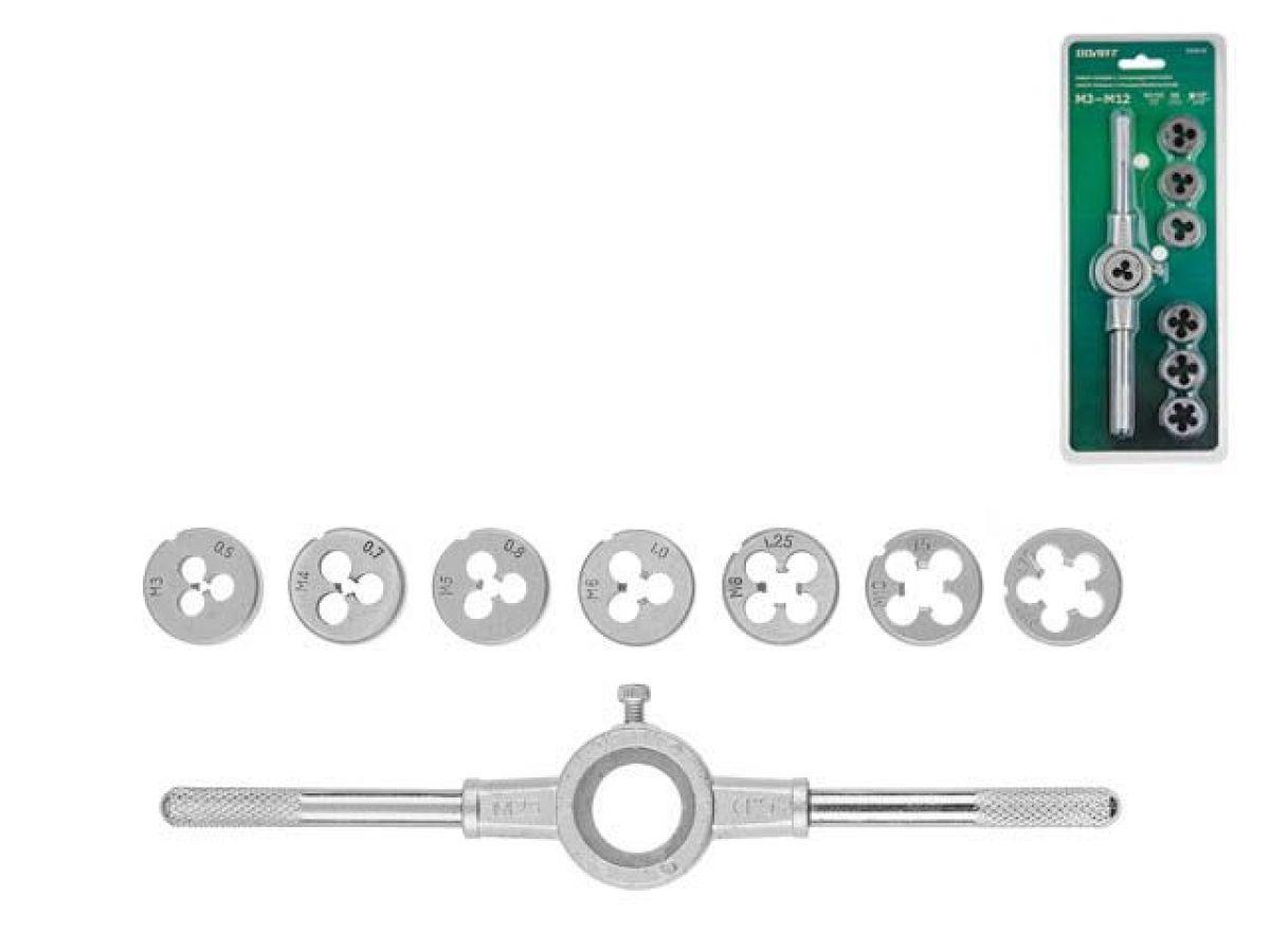 плашки: 9 шт. M3х0,5; M4х0,7; M5х0,8; M6х1,0; M7х1,0; M8х1,25; M9х1,25; M10х1,5; M12х1,75;