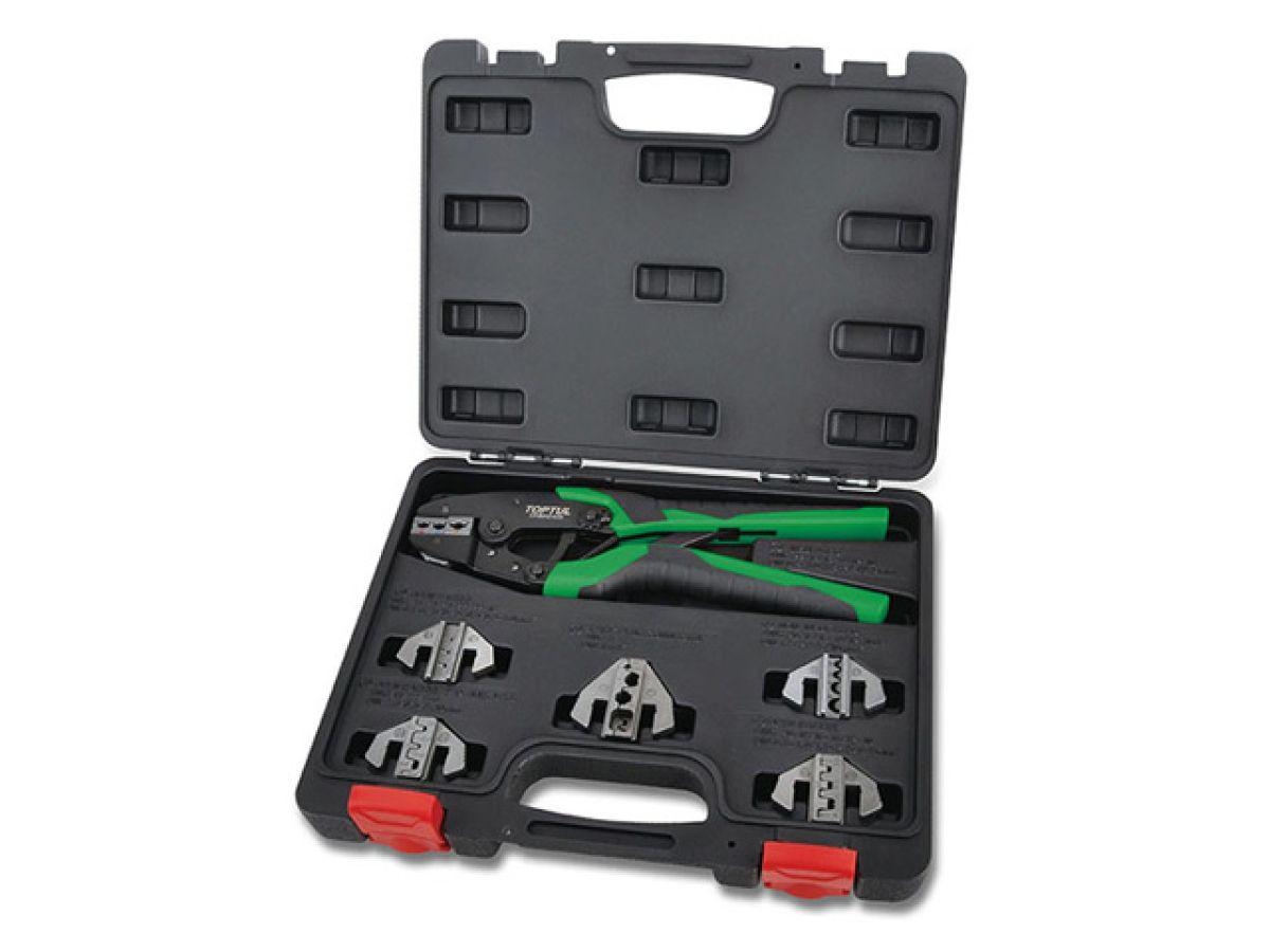| Набор для обжимки клемм TOPTUL состоит из щипцов и 5 сменных насадок и упакован в ударопрочный кейс размером 280х195х50 мм.