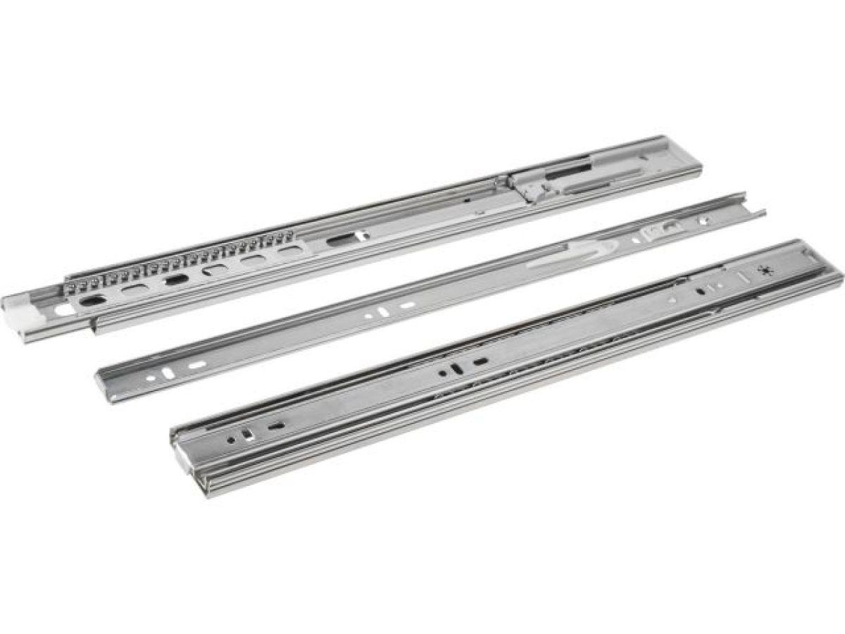 Эти направляющие имеют толщину стали 1.5 мм и рассчитаны на нагрузку 35 кг. Их телескопический механизм обеспечивает полный доступ к пространству ящика а их ход мягкий и бесшумный.