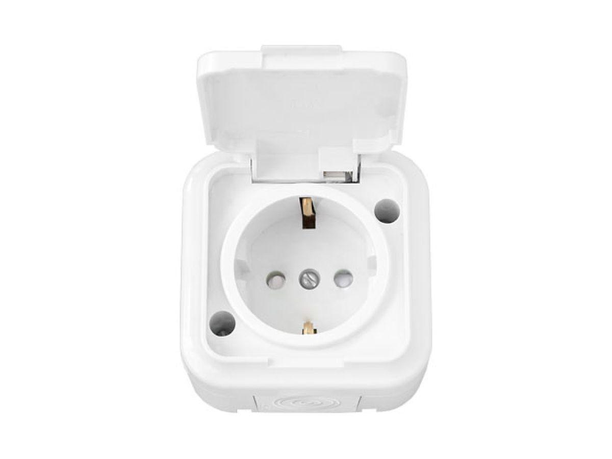| | Розетка 1-ая (открытая, с/з,з/ш, брызг. защ.) белая, Пралеска Аква, BYLECTRICA |