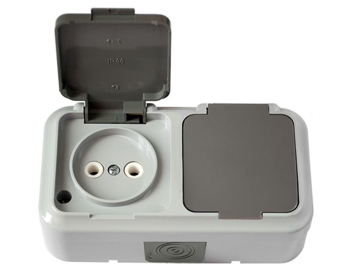 | | | Розетка 2-ая (открытая, б/з, брызг. защ.) серая, Пралеска Аква, Bylectrica (IP54 пылебрызгозащищенные) |