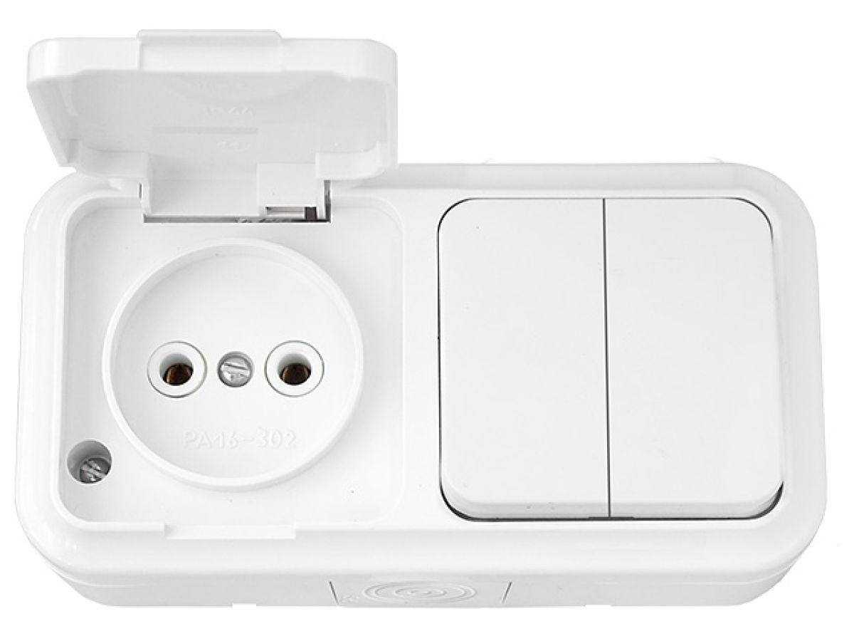 | | Блок выкл. 2 клав. + розетка (открытая, б/з, брызг. защ.) белая, Пралеска Аква, Bylectrica (IP54 пылебрызгозащищенные) |