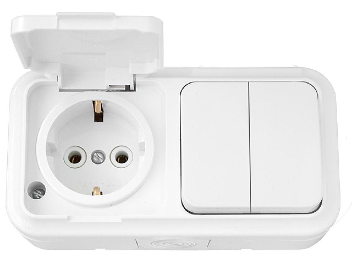 | | Блок выкл. 2 клав. + розетка (открытая, с/з, брызг. защ.) белая, Пралеска Аква, Bylectrica (IP54 пылебрызгозащищенные) |
